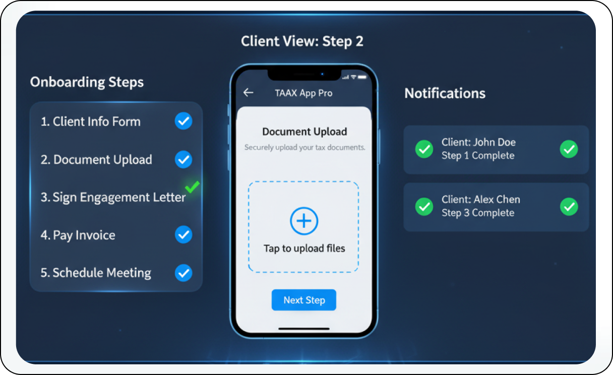TAAX APP is your one-stop shop for success. Manage appointments, streamline workflows, connect with clients, and more – all from a single, user-friendly platform.